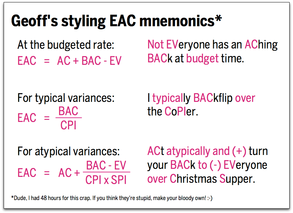 Okay, I know, “duh”, right? But when I was taking practice exams, this bloody thing kept tripping me up. Quality Assurance belongs to the Executing Process Group, and is something you do to verify that work is proceeding with quality processes. Quality Control belongs to the Monitoring and Controlling Process Group, and is something you do to validate the quality attributes of deliverables. Think of Quality Assurance as an evaluation of HOW you perform work, and Quality Control as an evaluation of WHAT your work produces. If you get questions relating to HOW or WHAT you’re checking, then you know which process group and associated techniques you should be thinking of.