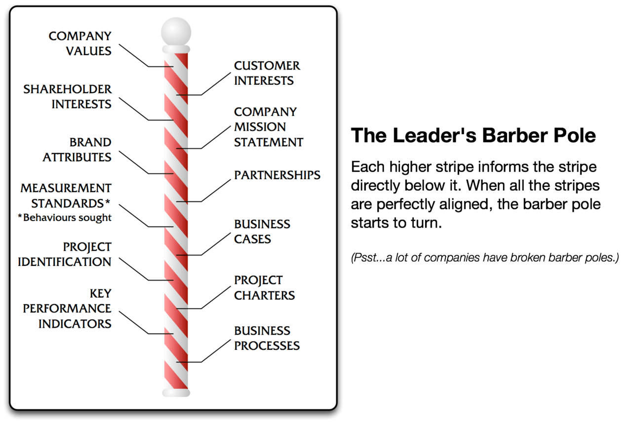 When all of the stripes on the barber pole are perfectly aligned, the barber pole happily starts to spin. If you’re having trouble keeping things moving within your organization, check to see if any stripes are missing!